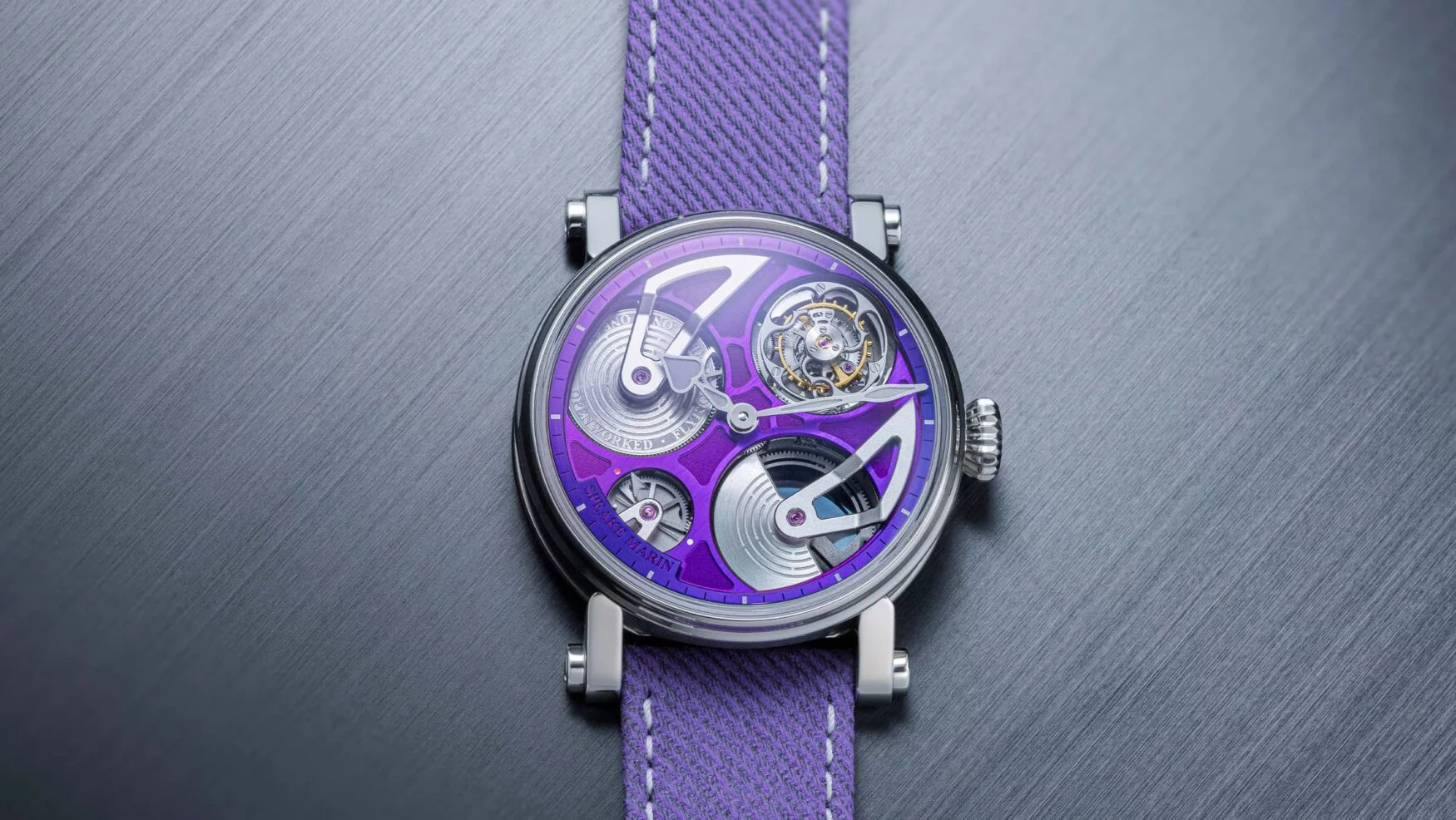 - The brand has taken its successful and highly revered One & Two Openworked Tourbillon and drenched its dial in an intense purple PVD coating, paired with a denim-style purple leather strap.