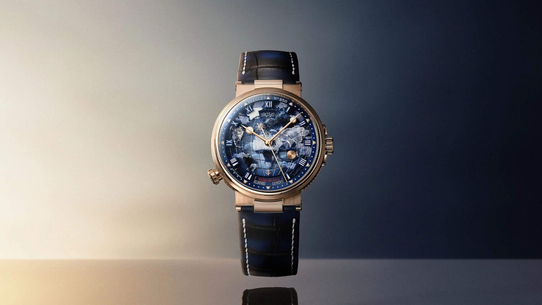 | Dial | Dual-layer hand-enamelled sapphire with blue gradient guilloche base |