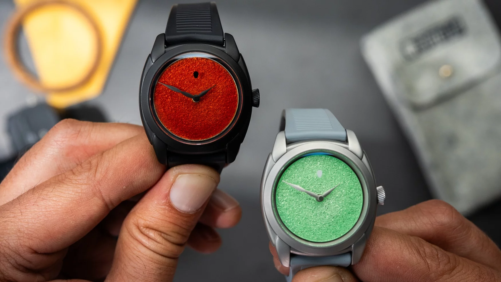 This process means that you need to be extremely specific with the number of layers you apply in order to reach the desired shade, whilst maintaining the wonderful texture underneath. Out of the two of these watches, I must say I prefer the volcanic orange model, the contrast between the black DLC case and that rich, shifting colour it surrounds is incredibly powerful. However, I certainly appreciate the decision to give the steel case of the green dial a full sandblasted texture as it juxtaposes the glistening mint dial and allows it to fully shine.